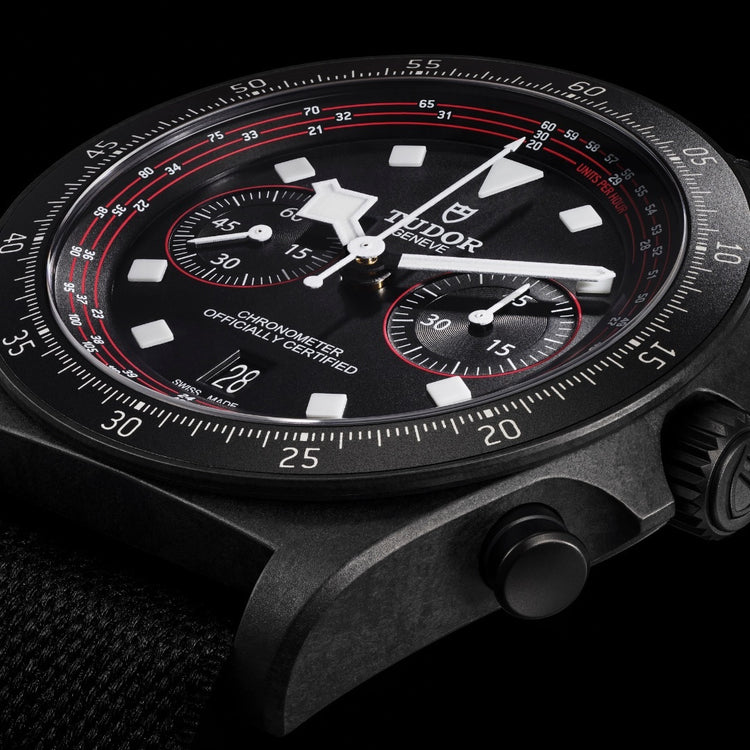 サイクリングチームの自転車に着想を得て、ケースには軽量なカーボンコンポジットを、3時位置のネジ込み式リューズとその上下に備わっているプッシャー、そして裏蓋にはチタンを採用しており、チューダー史上最も軽い時計となりました。