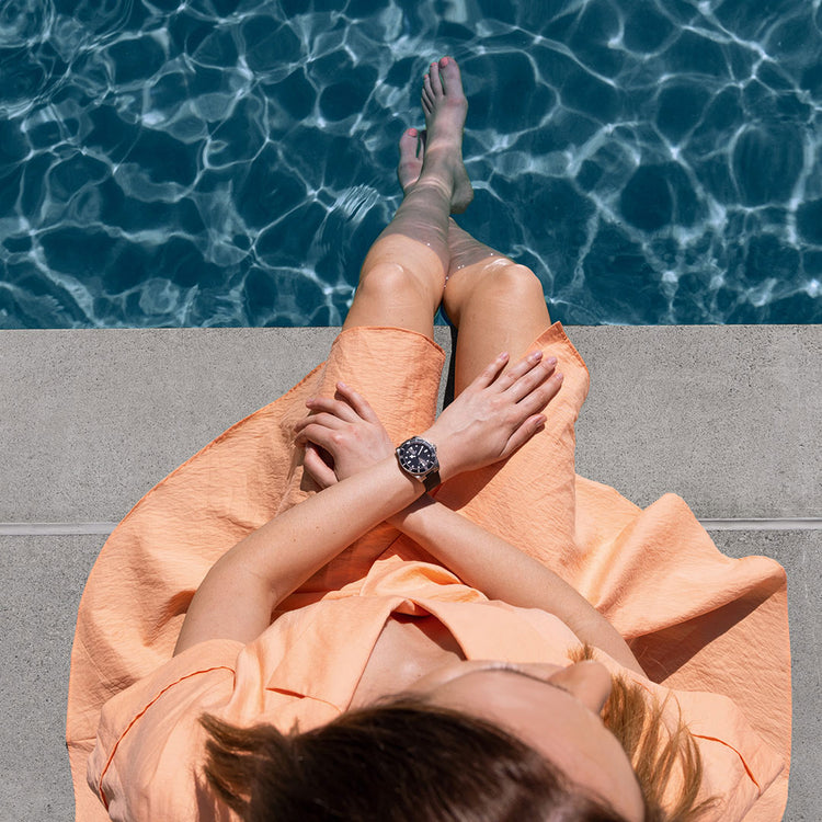カジュアルでありながら、大きすぎないサイズ感で洗練された知的な印象も演出し、何より39㎜径で優しく腕元に寄り添う最高の着用感が魅力の『ぺラゴス 39』。ビジネスシーンはもちろん、爽やかなサマースタイルの腕元に華を添えても素敵ですし、付属のブラックラバーストラップに付け替えることで、よりアクティブなスタイルにも合わせやすくなるので、アウトドアなイベントなどカジュアルスタイルのアクセントとしても、是非お楽しみいただきたいです!